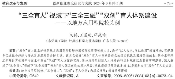 6. 2024年,實驗室團隊成員作為參與人獲得東莞理工學(xué)院第十一屆教學(xué)成果獎二等獎。在《創(chuàng)新創(chuàng)業(yè)理論研究與實踐》上發(fā)表教研教改論文《 “三全育人”視域下“三全三融”“雙創(chuàng)”育人體系建設(shè)——以地方應(yīng)用型院校為例》。