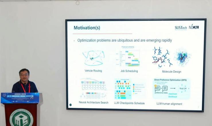 會上,南方科技大學(xué)唐珂教授為參會學(xué)者和師生分享了題為“Learn to Optimize”的主題報告。唐珂教授首先列舉了現(xiàn)實世界中眾多優(yōu)化問題,闡述了學(xué)習(xí)優(yōu)化思想的重要性,并進一步介紹了其團隊的主要研究內(nèi)容,即如何從自然界的智能系統(tǒng)中獲得靈感,嘗試構(gòu)建人工智能。隨后,唐珂教授向與會學(xué)者和師生分享了團隊的最新研究成果,包括算法演化理論、協(xié)同進化的人工智能和進化算法在圖優(yōu)化中的應(yīng)用。相關(guān)研究已成功應(yīng)用于多個實際場景,為優(yōu)化領(lǐng)域的發(fā)展提供了新的思路和方法。唐珂教授精彩的報告內(nèi)容和獨特的研究視角,讓在場的師生和學(xué)者們深受啟發(fā),贏得了陣陣熱烈的掌聲。