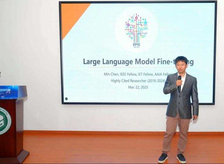 隨后,華南理工大學(xué)陳敏教授向與會人員分享了題為“Large Language Model Fine-tuning”的學(xué)術(shù)報告。會上,陳敏教授介紹了大語言模型的相關(guān)背景和發(fā)展歷程,并指出現(xiàn)有技術(shù)的不足,進而引出其團隊的主要工作。首先,針對大語言模型在特定領(lǐng)域中數(shù)據(jù)有限的挑戰(zhàn),陳敏教授介紹了其團隊所提出的NLFT微調(diào)技術(shù),該技術(shù)通過利用目標語言模型強大的語言理解能力,將自然語言的指導(dǎo)附加到Token級輸出上,從而實現(xiàn)更精準的模型調(diào)整。然后,通過計算概率識別出突出的Tokens。陳敏教授從實驗結(jié)果上展示了NLFT技術(shù)不僅大大降低了訓(xùn)練成本,還顯著提高了訓(xùn)練效率和準確性。此外,陳敏教授還向與會學(xué)者和師生介紹了其團隊在認知計算、6G網(wǎng)絡(luò)和大數(shù)據(jù)分析等領(lǐng)域的工作進展。陳敏教授的分享為參會人員帶來了新的思路和見解,特別是在大語言模型的微調(diào)技術(shù)方面。