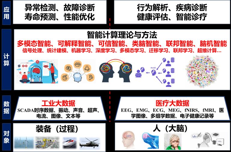 立足于“智能制造2025”、“30·60雙碳目標”、“健康中國2030”等國家重大戰(zhàn)略需求,以工業(yè)/醫(yī)療大數據為基礎,重點開展多模態(tài)智能、可解釋智能、可信智能、類腦智能、聯(lián)邦智能、邊緣智能等智能計算理論與方法基礎研究及其在工業(yè)裝備(過程)和人體(大腦)智能監(jiān)控和健康管理領域的應用。具體包括兩個方向: