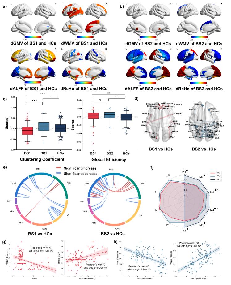 圖2. 兩種腦亞型之間的差異及其對(duì)應(yīng)的生物標(biāo)志物。(a) 腦亞型1與健康對(duì)照的差別;(b) 腦亞型2與健康對(duì)照的差別;(c) 腦網(wǎng)絡(luò)特征差異(*p < 0.05,**p < 0.01,***p < 0.001);(d) 腦功能連接差異;(e) 腦功能連接異常及其所在的網(wǎng)絡(luò);(f) 臨床癥狀和認(rèn)知表現(xiàn)方面的差異(●:p_all < 0.05, ○:p_BSs < 0.05);(g) 腦亞型1患者的PANSS和MCCB評(píng)分相關(guān)的生物標(biāo)志物;(h) 腦亞型2患者的PANSS評(píng)分相關(guān)的生物標(biāo)志物。