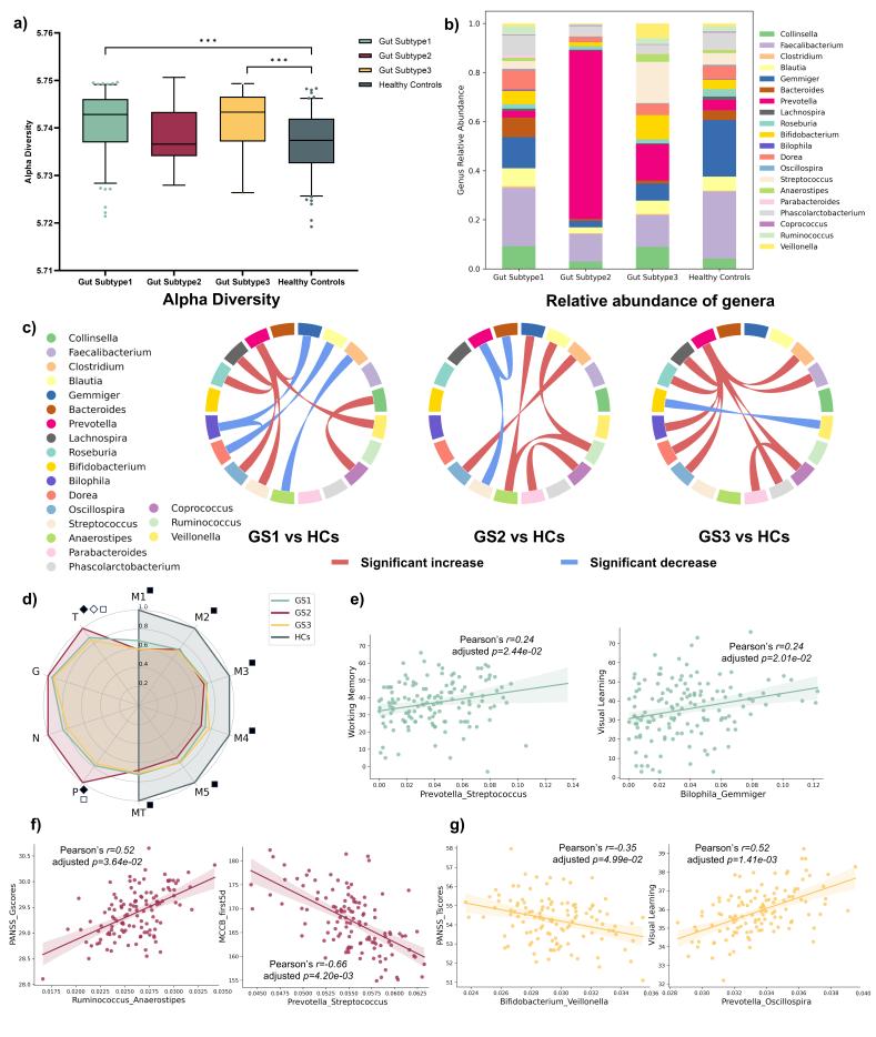圖3. 三種腸道亞型之間的差異及其對(duì)應(yīng)的生物標(biāo)志物。(a) α多樣性(***p < 0.001)差異;(b) 相對(duì)豐度的差異;(c) 菌屬之間異常的相互關(guān)系;(d) 臨床癥狀和認(rèn)知表現(xiàn)方面的差異;(e) 腸亞型1與MCCB評(píng)分相關(guān)的生物標(biāo)志物;(f) 腸亞型2與PANSS和MCCB評(píng)分相關(guān)的生物標(biāo)志物;(g) 腸亞型3與PANSS和MCCB評(píng)分相關(guān)的生物標(biāo)志物。