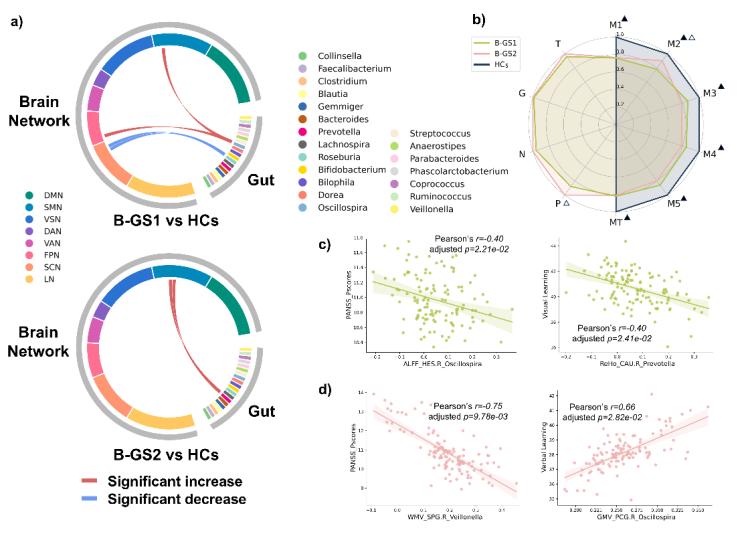 研究識(shí)別出兩種腦-腸亞型,腦-腸亞型1主要表現(xiàn)為腦功能與特定腸道菌群之間的連接異常;而腦-腸亞型2則以腦結(jié)構(gòu)與特定菌群之間的異常連接為主,常伴隨明顯的陽(yáng)性癥狀。
