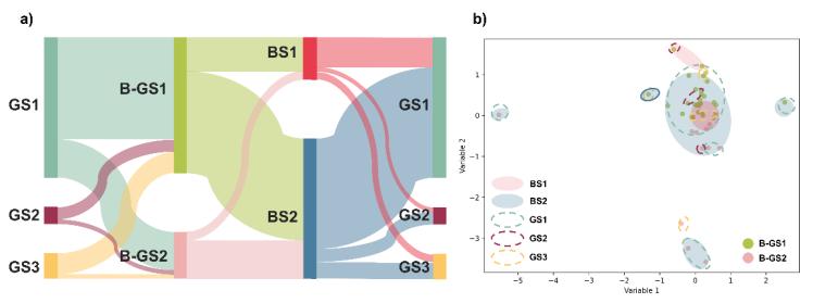 圖5. 精神分裂癥多種生物學(xué)亞型之間的重疊關(guān)系。(a) ?;鶊D展示了多種生物學(xué)亞型之間的重疊情況;(b) 散點(diǎn)圖顯示了各亞型在三類生物學(xué)數(shù)據(jù)集中的分布模式。