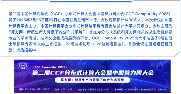 第二屆中國(guó)計(jì)算機(jī)學(xué)會(huì)(CCF)分布式計(jì)算大會(huì)暨中國(guó)算力網(wǎng)大會(huì)(CCF Computility 2025)將于2025年7月25日至27日在中國(guó)甘肅蘭州市舉行。CCF理事長(zhǎng)孫凝暉研究員、國(guó)防科技大學(xué)王懷民教授共同擔(dān)任大會(huì)主席。大會(huì)指導(dǎo)委員會(huì)由國(guó)內(nèi)外頂尖專家學(xué)者組成,其中包括陳國(guó)良教授、于全研究員、廖湘科研究員、鄭緯民教授、王懷民教授、孫凝暉研究員、張平教授、錢德沛教授、張宏科教授、蔣昌俊教授、黃建平教授、徐志偉研究員、金海教授、吳杰教授、過(guò)敏意教授、陳貴海教授、盧宇彤教授等。會(huì)議期間,將深入探討分布式計(jì)算與算力網(wǎng)的最新進(jìn)展,就分布式計(jì)算與系統(tǒng)的諸多科研問(wèn)題與產(chǎn)業(yè)發(fā)展展開激烈的思想碰撞與交流。大會(huì)將同時(shí)舉辦20場(chǎng)技術(shù)論壇和多個(gè)競(jìng)賽單元,將能有力的推動(dòng)分布式計(jì)算與系統(tǒng)的發(fā)展,培養(yǎng)和選拔這方面的優(yōu)秀人才。