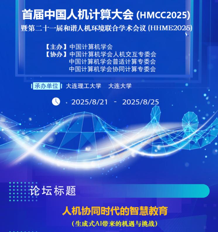 CCF協(xié)同計(jì)算專委參與協(xié)辦的首屆中國(guó)人機(jī)計(jì)算大會(huì)(HMCC2025)將于8.21-25在大連舉行,專委將組織一系列高質(zhì)量學(xué)術(shù)論壇,其中,將舉辦“人機(jī)協(xié)同時(shí)代的智慧教育”報(bào)告會(huì),聚焦“人機(jī)協(xié)同”在智慧教育中的關(guān)鍵作用,分析大語言模型等生成式AI在個(gè)性化教學(xué)、智能評(píng)估、學(xué)習(xí)路徑推薦等方面的應(yīng)用潛力,展示人機(jī)協(xié)同在提升教學(xué)效率與學(xué)習(xí)體驗(yàn)中的實(shí)際成效。歡迎大家積極參加。