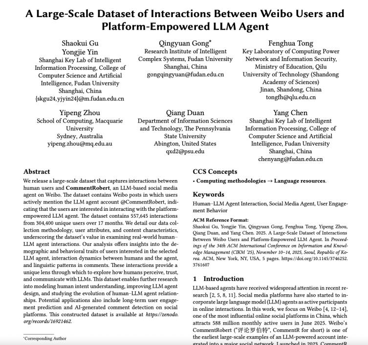 我們的論文"A Large-Scale Dataset of Interactions Between Weibo Users and Platform-Empowered LLM"今年被收錄于ACM CIKM'25的Resource Track,本論文采集并開源了新浪微博官方大語言模型賬號“評論羅伯特”與廣大微博用戶的交互數(shù)據(jù)。數(shù)據(jù)集包含了評論羅伯特賬號從2023年12月1日發(fā)布以來,直到2025年4月30日,“評論羅伯特”賬號和其他微博用戶之間的全部交互內(nèi)容。這些交互數(shù)據(jù)涵蓋了超過30萬個微博用戶,超過102萬條微博(每條微博包含至少1條來自“評論羅伯特”賬號的回復(fù))。