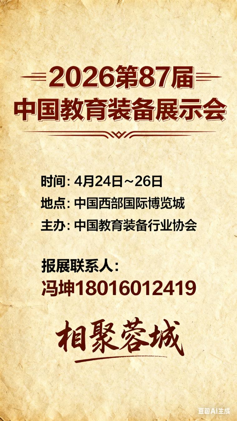 由中國(guó)教育裝備行業(yè)協(xié)會(huì)主辦,四川省教育廳、成都市人民政府承辦的“第87屆中國(guó)教育裝備展示會(huì)”,將于2026年4月在四川成都中國(guó)西部國(guó)際博覽城隆重舉行。在此,我們向全國(guó)各地教育界的同仁、教育裝備生產(chǎn)經(jīng)營(yíng)企業(yè)的朋友們,以及所有關(guān)心教育事業(yè)的各界人士,發(fā)出最誠(chéng)摯的邀請(qǐng)!