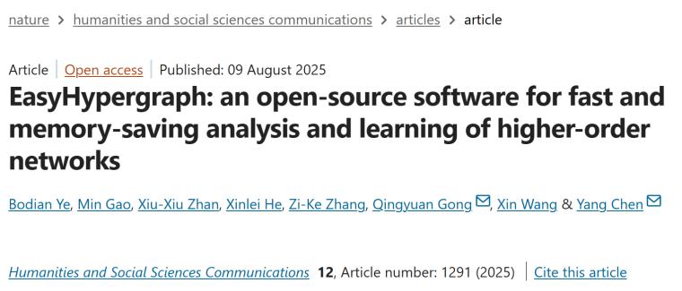 復(fù)旦大學(xué)網(wǎng)絡(luò)大數(shù)據(jù)實驗室牽頭完成的論文EasyHypergraph: an open-source software for fast and memory-saving analysis and learning of higher-order networks,于2025年8月發(fā)表于Nature旗下的Humanities and Social Sciences Communications期刊。論文主要介紹了開源超圖結(jié)構(gòu)分析工具箱EasyHypergraph的設(shè)計與實現(xiàn),支持一系列重要的超圖分析(hypergraph analysis)和超圖學(xué)習(xí)(hypergraph learning)功能,并在計算速度和內(nèi)存占用兩方面實現(xiàn)了較好的優(yōu)化,取得了比已有解決方案更快的計算速度和更小的內(nèi)存占用。EasyHypergraph能夠有效助力多學(xué)科科研人員開展高階網(wǎng)絡(luò)(higher-order networks)相關(guān)研究,也已經(jīng)成為了EasyGraph工具箱的核心模塊之一。