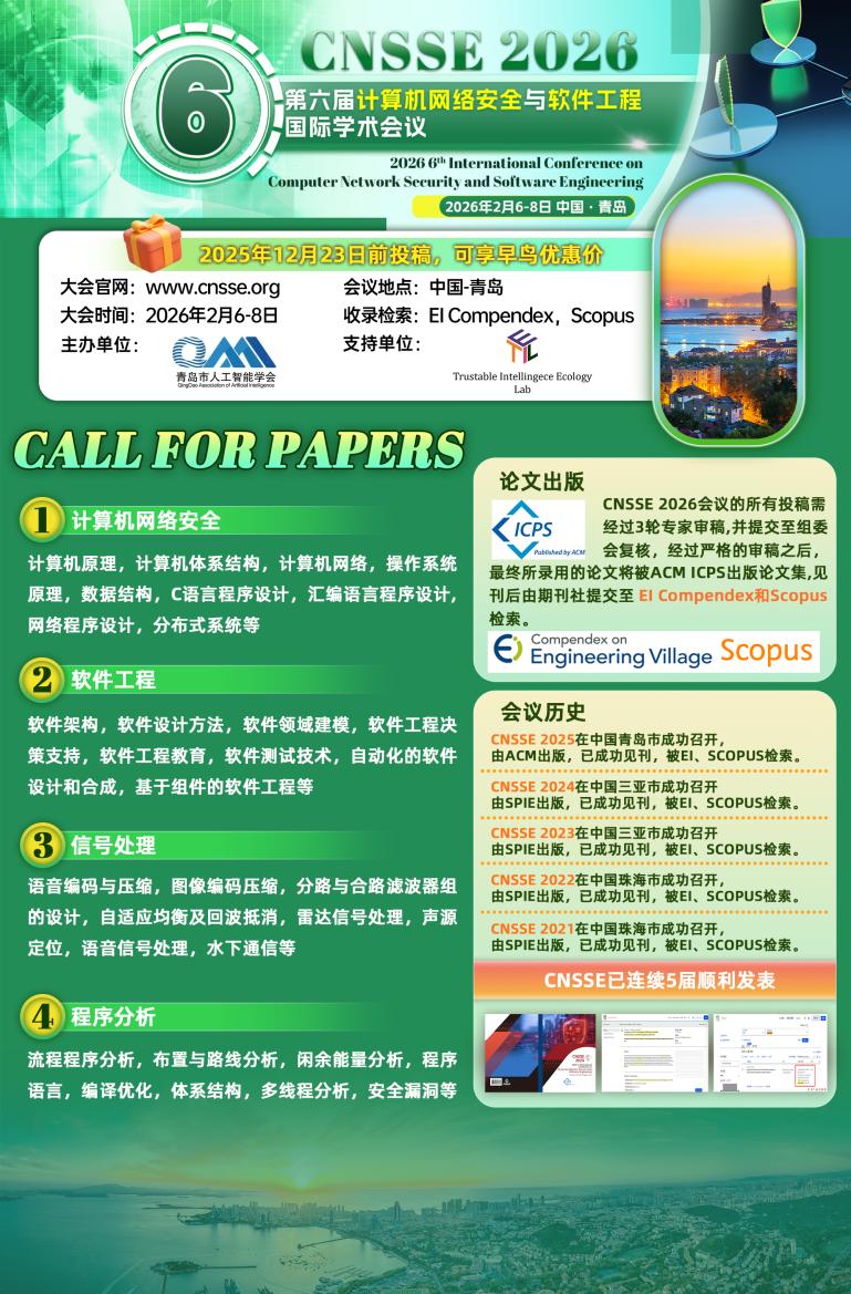 第六屆計算機網(wǎng)絡(luò)安全與軟件工程國際學(xué)術(shù)會議(CNSSE 2026)將于2026年2月6-8日在中國-青島舉行。CNSSE 2026專注于計算機網(wǎng)絡(luò)安全、軟件工程、信號處理、程序分析等領(lǐng)域,致力于搭建計算機領(lǐng)域?qū)W術(shù)資源共享平臺,擴大國際科研學(xué)術(shù)合作交流渠道;加強計算機網(wǎng)絡(luò)安全建設(shè),探索建設(shè)強壯的端點安全生態(tài)系統(tǒng),增強防護(hù)新型網(wǎng)絡(luò)攻擊的能力;助力鏈接相關(guān)領(lǐng)域國內(nèi)外專家學(xué)者通過經(jīng)驗分享和智慧碰撞,推動科研學(xué)術(shù)成果轉(zhuǎn)化和人才、技術(shù)、資本聚集,提升發(fā)展新動能。