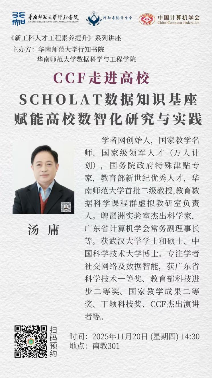 2025年12月4日,中國計算機(jī)學(xué)會(CCF)走進(jìn)高校系列活動第1335場暨華南師范大學(xué)行知書院和數(shù)據(jù)科學(xué)與工程學(xué)院聯(lián)合主辦《新工科人才工程素養(yǎng)提升》系列講座在華師汕尾校區(qū)舉行。CCF協(xié)同計算專委原主任湯庸教授和常委劉冬寧教授分別做了主題講座。報告會由數(shù)據(jù)科學(xué)與工程學(xué)院謝承旺院長和汕尾校區(qū)黨委副書記,行知書院副院長唐小煜主持。
