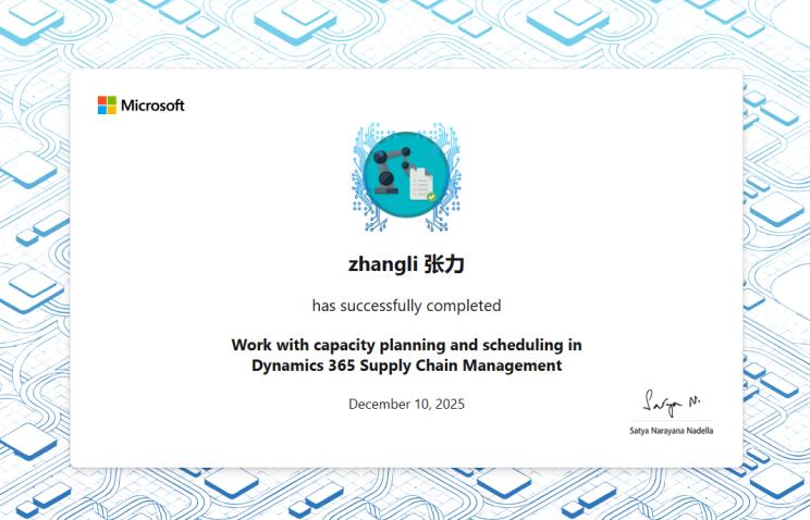 2025年12月10日,完成“微軟培訓(xùn)課程:Work with capacity planning and scheduling in Dynamics 365 Supply Chain Management”。