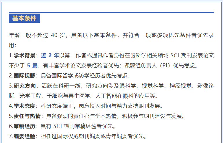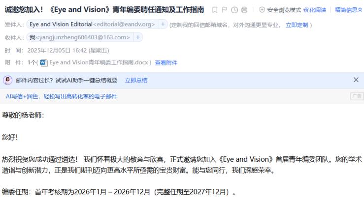 最近收到《Eye and Vision》(IF=4)編輯部 領(lǐng)導(dǎo)的郵件,確認(rèn)入選為該期刊的首屆青年編委 ,倍感榮幸。據(jù)了解,《Eye and Vision》 連續(xù)4年位列JCR Q1區(qū),2024年最新影響因子 4.0,在全球98本眼科學(xué)期刊中排名第13位。連續(xù)3年CiteScore位居Q1區(qū),2024年引用分高達(dá) 8.0,全球排名11/141。國內(nèi)頂尖評(píng)級(jí):連續(xù)3年入選《中國科學(xué)院文獻(xiàn)情報(bào)中心期刊分區(qū)表》眼科學(xué) 1區(qū) 期刊。連續(xù)7年入選“中國最具國際影響力學(xué)術(shù)期刊”榜單,并于2024年成功入選 中國科技期刊卓越行動(dòng)計(jì)劃二期英文梯隊(duì)期刊項(xiàng)目,是國家重點(diǎn)支持的國際化學(xué)術(shù)平臺(tái)。以下為相關(guān)邀請郵件: