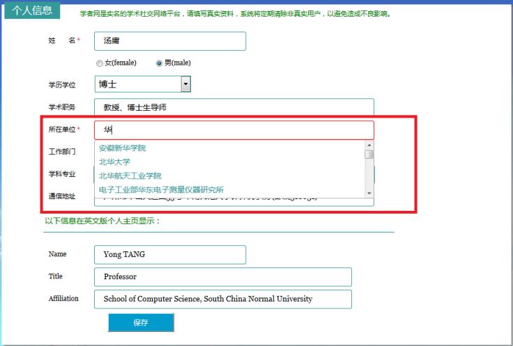 所在單位選項默認(rèn)使用的是教育部最新高校列表,用戶出入關(guān)鍵字后會有提示,用戶可以選擇提示內(nèi)容,也可以自定義,具體如下圖: