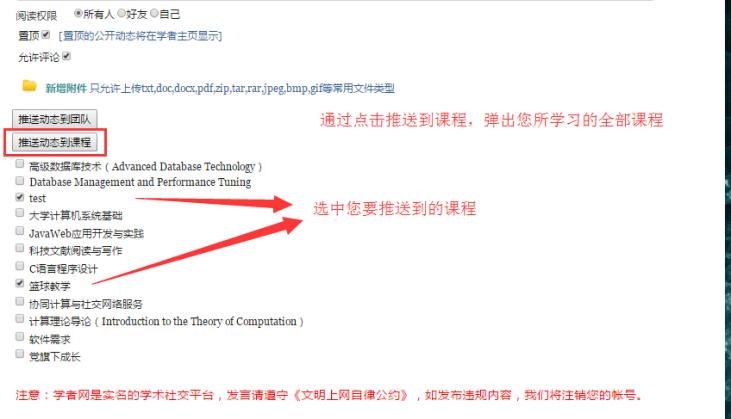 通過發(fā)布動態(tài),您可以將您發(fā)布的內(nèi)容推送到相應(yīng)課程的互動交流中,具體操作如下圖所示: