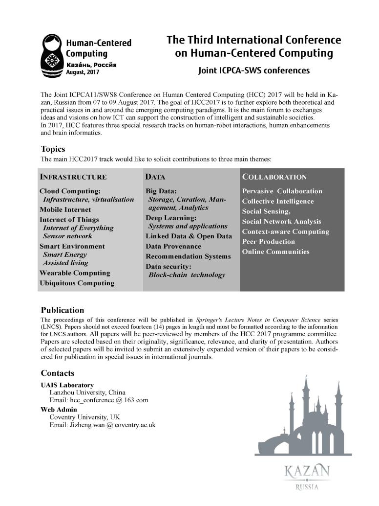 HCC2017(原ICPCA)會(huì)議將在俄羅斯喀山大學(xué)召開,時(shí)間2017年8月7-9日,2017年3月31日截稿。HCC2017會(huì)議網(wǎng)站將攜手學(xué)者網(wǎng)對外發(fā)布更新,細(xì)節(jié)敬請期待。
