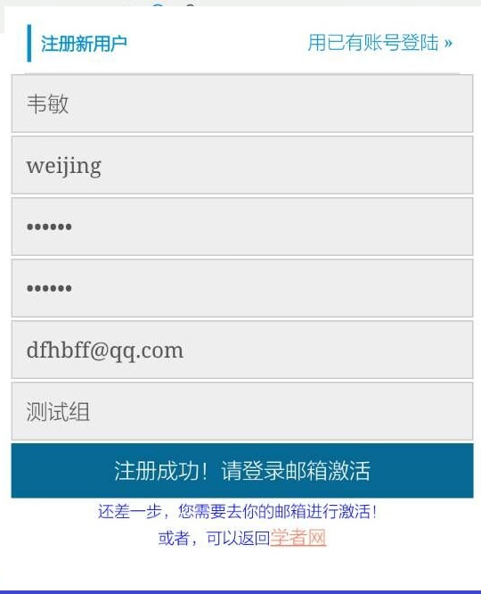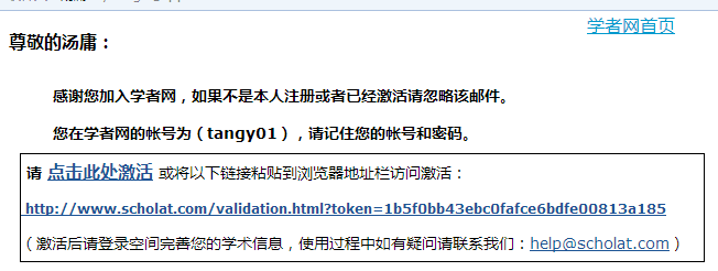 3)你需要在所填寫的郵箱查收學(xué)者網(wǎng)發(fā)給的激活郵件(圖3),若確定注冊只需點擊按鈕就完成。