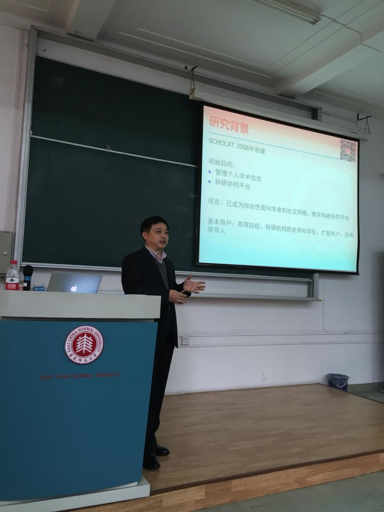 報告中,湯庸教授主要介紹了自主開發(fā)的學術社交網絡“學者網”及基于學者網大數據研究和應用的最新成果,與會師生進行了互動交流和討論。林學民教授主持了報告會。