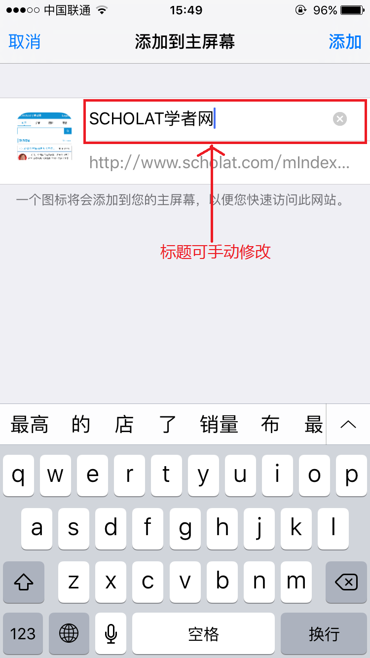 Safari瀏覽器為蘋果手機(jī)自帶的瀏覽器。我們只需要點(diǎn)擊下方的功能鍵(如圖所示),接著點(diǎn)擊“添加到主屏幕”,這時(shí)我們可以根據(jù)自己的習(xí)慣修改標(biāo)簽的標(biāo)題,最后點(diǎn)擊“添加”即可完成添加到桌面。
