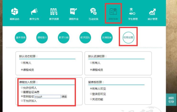 在課程信息模塊下,您可以設(shè)置課程的加入權(quán)限,設(shè)置了該權(quán)限后,學(xué)生想要加入您的課程,在申請(qǐng)時(shí),只需要輸入您設(shè)置的密碼即可加入課程,不需要您在課程提醒里一個(gè)個(gè)的去接受申請(qǐng);
