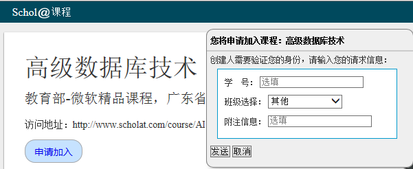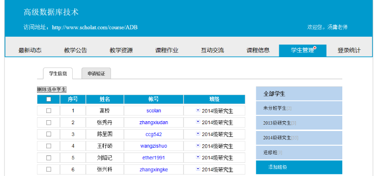 創(chuàng)建人為的課程管理員。創(chuàng)建人可以邀請其他教師或助教加盟“教學(xué)隊(duì)伍”,共同管理課程平臺。教師管理課程學(xué)生及班級,通知學(xué)生加入課程。學(xué)生注冊學(xué)者網(wǎng)(若沒有學(xué)者網(wǎng)賬號),訪問課程網(wǎng)站,點(diǎn)擊“申請加入”。這樣就建立的課程平臺的師生協(xié)作教學(xué)關(guān)系。
