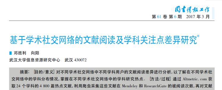 5.武漢大學(xué)信息資源研究中心鄧勝利教授2017年3月在《圖書情報(bào)工作》發(fā)表研究論文“基于學(xué)術(shù)社交網(wǎng)絡(luò)的文獻(xiàn)閱讀級學(xué)科關(guān)注點(diǎn)差異研究”(本文系教育部人文社會(huì)科學(xué)重點(diǎn)研究基地重大項(xiàng)目“我國服務(wù)業(yè)信息化推進(jìn)與保障機(jī)制研究”( 項(xiàng)目編號: 15JJD870001) 和武漢大學(xué)“351人才計(jì)劃項(xiàng)目”研究成果之一),對學(xué)者網(wǎng)中不同學(xué)術(shù)社會(huì)網(wǎng)絡(luò)中的學(xué)科研究熱點(diǎn)進(jìn)行分析。
