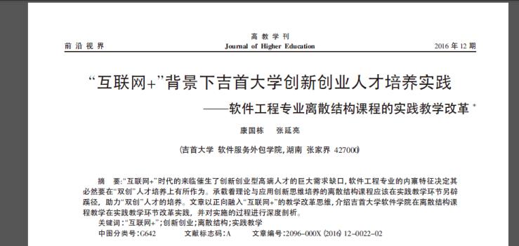 4.吉首大學(xué)軟件服務(wù)外包學(xué)院康國棟博士2016年12月在《高教學(xué)刊》發(fā)表教改項(xiàng)目論文““互聯(lián)網(wǎng)+”背景下吉首大學(xué)創(chuàng)新創(chuàng)業(yè)人才培養(yǎng)實(shí)踐”(基金項(xiàng)目:湖南省高校軟件工程專業(yè)“十二五”綜合改革試點(diǎn)項(xiàng)目;吉首大學(xué)實(shí)驗(yàn)教學(xué)改革項(xiàng)目),提到了學(xué)者網(wǎng)團(tuán)隊(duì)匹配技術(shù)模式。