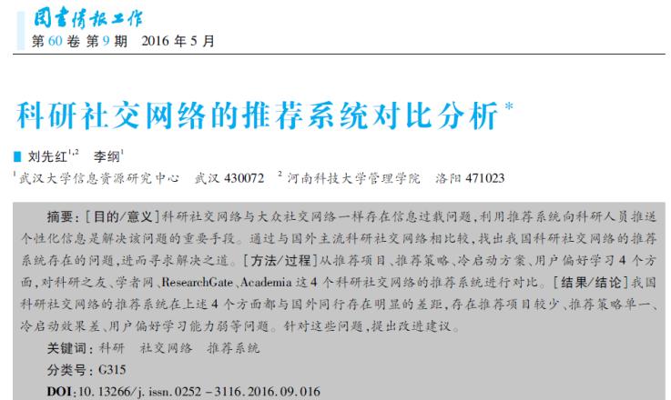 1.武漢大學(xué)信息資源研究中心劉先紅博士2016年5月在《圖書情報(bào)工作》發(fā)表科研論文“科研社交網(wǎng)絡(luò)的推薦系統(tǒng)對比分析”,對學(xué)者網(wǎng)中的推薦功能和其他科研社交網(wǎng)絡(luò)進(jìn)行了對比分析。