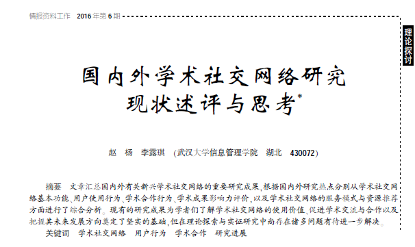 2.武漢大學(xué)信息管理學(xué)院趙楊副教授2016年6月在《情報(bào)資料工作》發(fā)表項(xiàng)目論文“國內(nèi)外學(xué)術(shù)社交網(wǎng)絡(luò)研究現(xiàn)狀述評與思考”,對學(xué)者網(wǎng)基本功能、用戶使用行為、學(xué)術(shù)合作行為、學(xué)術(shù)成果影響力評價(jià),以及學(xué)術(shù)社交網(wǎng)絡(luò)的服務(wù)模式與資源推薦方面進(jìn)行了綜合分析。