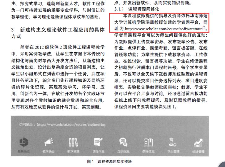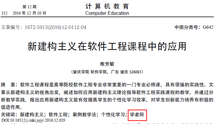 3.肇慶學(xué)院熊芳敏老師2016年12月在《計(jì)算機(jī)教育》發(fā)表教學(xué)論文“新建構(gòu)主義在軟件工程課程中的應(yīng)用”(基金項(xiàng)目:廣東省本科高校高等教育教學(xué)改革項(xiàng)目和肇慶學(xué)院校級質(zhì)量工程及教改項(xiàng)目),對學(xué)者網(wǎng)課程平臺進(jìn)行了評述。