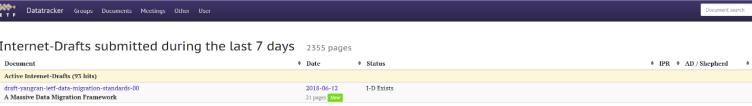 2018年6月12日,華南理工大學(xué)SCUT、浪潮Inspur、中國(guó)電信廣州研究院GSTA與華為Huawei等單位聯(lián)合起草的基于Web的大數(shù)據(jù)遷移框架標(biāo)準(zhǔn)Internet-Draft已正式向IETF國(guó)際互聯(lián)網(wǎng)工程任務(wù)組提交, 經(jīng)過審批后草案已發(fā)布征求意見。該項(xiàng)工作獲廣東省科技廳重大專項(xiàng)與國(guó)家自然科學(xué)基金廣州超算數(shù)據(jù)中心項(xiàng)目支持。本實(shí)驗(yàn)室承擔(dān)了該標(biāo)準(zhǔn)的牽頭起草與協(xié)調(diào)執(zhí)行工作。