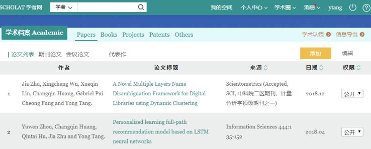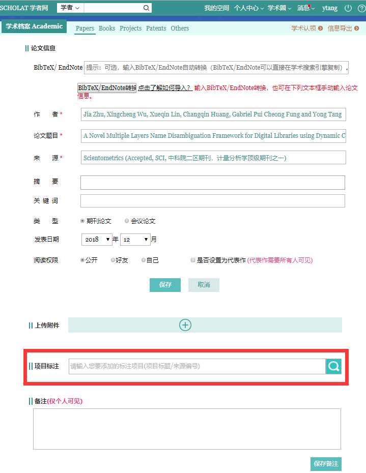 進入學(xué)術(shù)檔案界面,選擇“Papers”或者“Project”,點擊添加,進入添加項目或添加論文界面