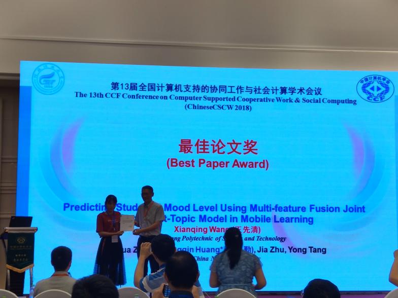 第13屆全國計算機支持的協(xié)同工作與社會計算學術會議(Chinese Conference on Computer Supported Cooperative Work and Social Computing, ChineseCSCW2018)傳來捷報,研究團隊論文“Predicting Students' Mood Level Using Multi-feature Fusion Joint Sentiment-Topic Model in Mobile Learning”(作者:王先清、趙美華、黃昌勤*、朱佳、湯庸)獲得最佳論文獎,這是我們團隊繼2015年之后再次獲得中國協(xié)同計算學術會議最佳論文獎(注1)。