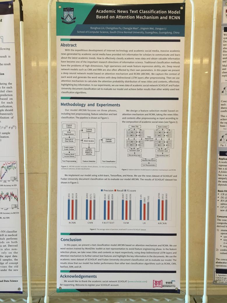 趙美華研究生宣讀了論文“Predicting Students' Mood Level Using Multi-feature Fusion Joint Sentiment-Topic Model in Mobile Learning”,林榮華研究生對論文“Academic News Text Classification Model Based on Attention Mechanism and RCNN”做了poster展示。