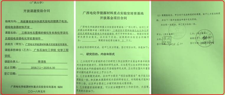 最近,廣西電化學(xué)能源材料重點(diǎn)實(shí)驗(yàn)室培育基地2018年度開放基金申報(bào)及評(píng)選工作現(xiàn)已落下帷幕(http://www.gxu.edu.cn/Item/18372.aspx)。該實(shí)驗(yàn)室培育基地于2016年10月獲得廣西壯族自治區(qū)科技廳批準(zhǔn)成立,依托單位為廣西大學(xué)可再生能源材料協(xié)同創(chuàng)新中心。實(shí)驗(yàn)室研究方向?yàn)殡娀瘜W(xué)高端催化材料、石墨烯基電化學(xué)能源材料和新型電化學(xué)儲(chǔ)能材料。非常榮幸的是,我們研究團(tuán)隊(duì)成功拿到了一項(xiàng)重點(diǎn)項(xiàng)目(3萬元)——三維活性石墨烯制備與應(yīng)用相關(guān)項(xiàng)目,這為促進(jìn)我校和廣西大學(xué)的科技合作奠定了有利基礎(chǔ)。