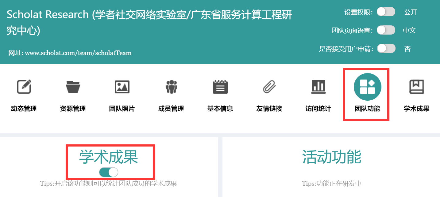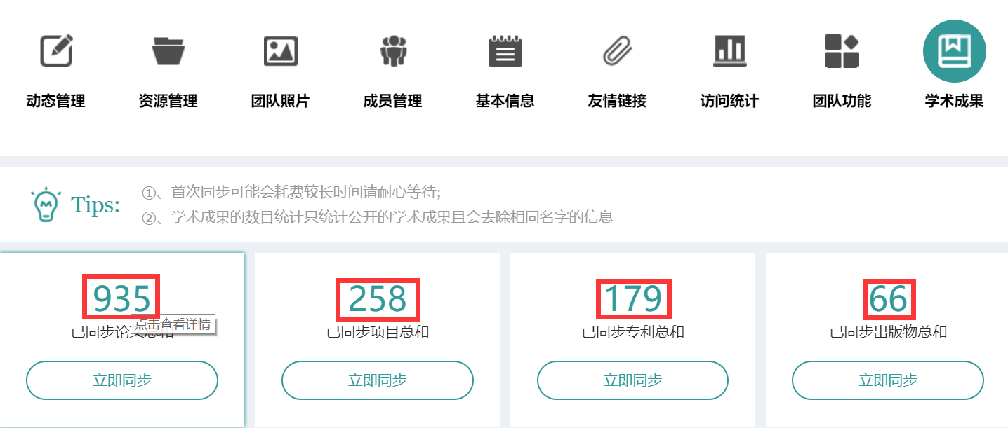 首先進(jìn)入團(tuán)隊(duì)管理界面,點(diǎn)擊團(tuán)隊(duì)功能選項(xiàng),開(kāi)啟學(xué)術(shù)成果模塊