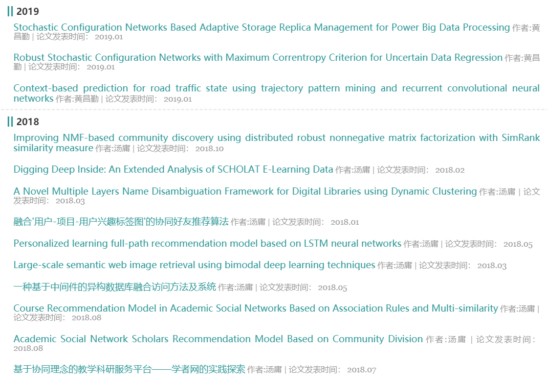 我們可以看到,每一項(xiàng)學(xué)術(shù)成果的數(shù)量、按照年份的可視化統(tǒng)計(jì)圖就展示在眼前!點(diǎn)擊每個(gè)項(xiàng)目的統(tǒng)計(jì)值,可以進(jìn)入各項(xiàng)目的詳細(xì)信息展示頁(yè)面: