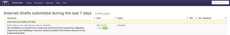 2018年10月23日,華南理工大學(xué)SCUT、浪潮Inspur與網(wǎng)易NetBase等單位聯(lián)合起草的面向互聯(lián)網(wǎng)的可伸縮Web軟件系統(tǒng)非編程構(gòu)造、遷移、部署和發(fā)布云服務(wù)框架與協(xié)議標(biāo)準(zhǔn)Internet-Draft已正式向IETF國(guó)際互聯(lián)網(wǎng)工程任務(wù)組提交, 經(jīng)過(guò)審批后草案已發(fā)布征求意見(jiàn)。該項(xiàng)工作獲廣東省科技廳重大專項(xiàng)與國(guó)家自然科學(xué)基金廣州超算數(shù)據(jù)中心項(xiàng)目支持。本實(shí)驗(yàn)室承擔(dān)了該標(biāo)準(zhǔn)的牽頭起草與協(xié)調(diào)執(zhí)行工作。